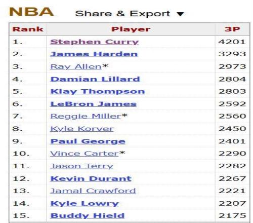 NBA总三分榜前五位