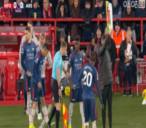 第54分钟,阿森纳连换三人,萨卡、热苏斯、梅里诺替补登场