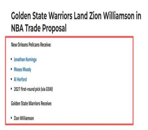 双赢还是冤大头勇士4换1交易方案,锡安辅佐库里,库明加去鹈鹕